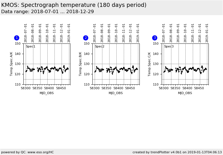 Temperature of spectrographs A, B, and C versus time, as recorded in the headers