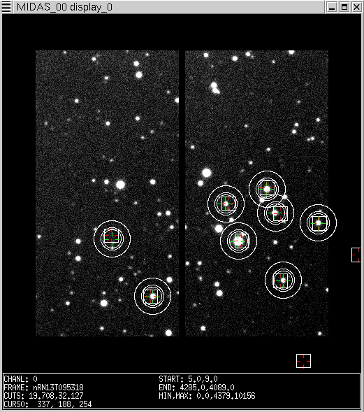 The measurements interface finds and measures the stars automatically on the frames (works quite well, cf Fig.1). For this reason, most of the original routines (called TMAG_something.prg or TMAG/something in Midas) have been evolved to AMAG_something (for "Automatic" Tmag). While it might be confusing, AMAG is just an upgrade of TMAG.