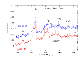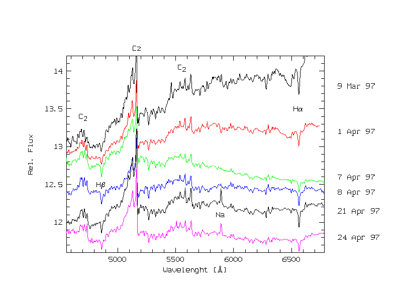 During each observation run, spectra of a helium-argon calibration lamp, flat-fields and spectrophotometric standard stars were recorded. Each of the Hale-Bopp comet spectra shown in the accompanying figures, except that on March 9, have been averaged from 3 or 4 individual exposures. In accordance to the sky clearness and altitude, the comet exposures ranged between 80 and 300 seconds. The spectra were also bias and dark-current subtracted. The relative flux correction was performed with the help of Etha Ursae Majoris (HR5191) as standard star. The spectra are not, however, corrected by the Sky Rayleigh dispersion.