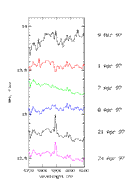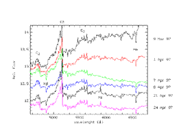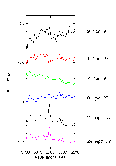 Of particular interest in these observations is the evolution of the Sodium emission line observed in the core of the comet. The corresponding spectral region is seen on these spectral tracings (left).The line is clearly visible on top of the spectral continuum (the reflected sunlight from the dust) in the last two runs (21 and 24 April), just after the discovery of the Na tail ( the 23th April ).Note that this sodium doublet (in our spectra it is blended due to the low resolving power) seems to appear already in the first spectrum obtained on March 9, 1997.