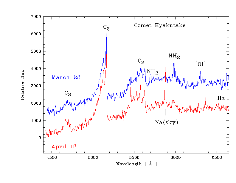 The recording shows two spectra obtained by the same team on March 28 and April 16, 1996.