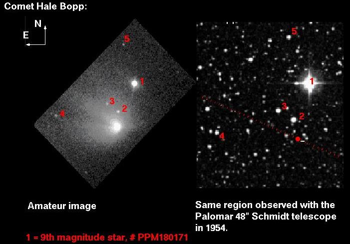 Here is the famous picture (on the left, image obtained and sent on the net by Chuck Shramek). It is a decent picture of Hale Bopp, nicely showing its jets. I rotated the original image to set North up and East left, to compare it to a portion of the Digital Sky Survey (right, a scan of an old plate take at the Palomar observatory in 1954). I marked a few common stars, and plotted the path of the comet.
