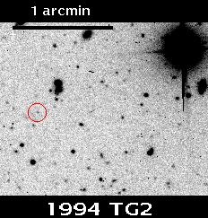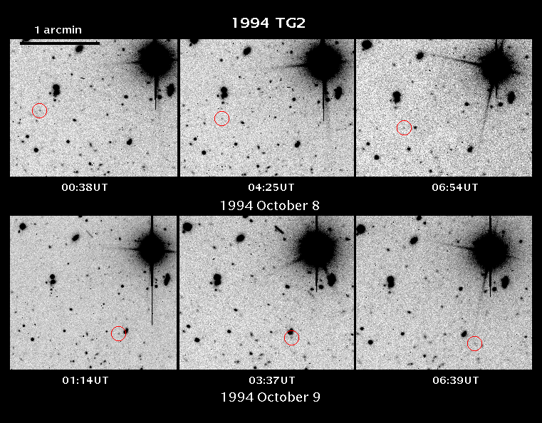 It was detected because of its extremely slow motion, only 3 arcsec/hour. Six accurate positions were measured and allowed to determine an approximate distance of about 42 AU, that is 6300 million kilometres from the Sun. This is far outside the orbit of the outermost, large planet, Neptune (4500 million kilometres); hence the classification as a "transneptunian" object. These six images show the motion of 1994 TG2 in front of the background images.