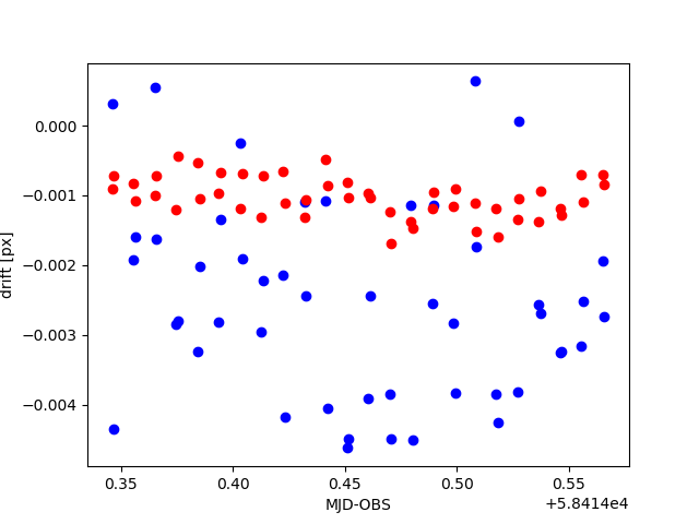 show a scatter of about +/- 2.5E-03 pixels whereas in the red arm the scatter