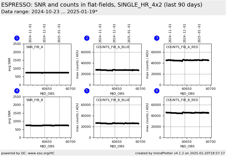Trending plots for flat-field calibrations. The plot show the minimum signal-to-noise ratio (SNR) that is achieved per spectroscopic order and the maximum number of counts per detector. Counts are converted from ADU into electrons. The plots come separately for fibre A and B.