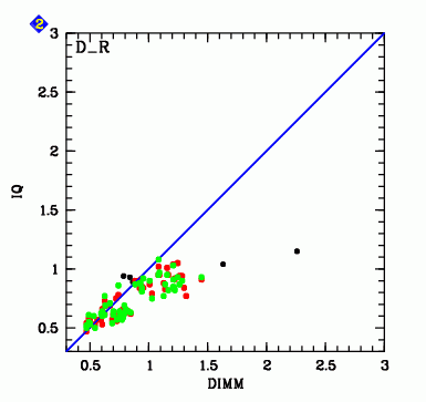 This plot shows the observed image quality for the R_BESS filter (black dots: old CCD, red/green dots: new CCDs) vs. the corrected DIMM seeing. The blue line gives the 1:1 relation. Obviously the FORS1 image quality tends to be better than the DIMM seeing for DIMM seeing > 1.2".
