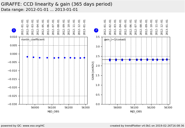 This is the trending plot for the monitoring of the GIRAFFE CCD linearity and gain. These parameters are derived from image flats. These data are taken about monthly. Since 2008-07, they are acquired with the common detector monitoring template and reduced with the corresponding common recipe.