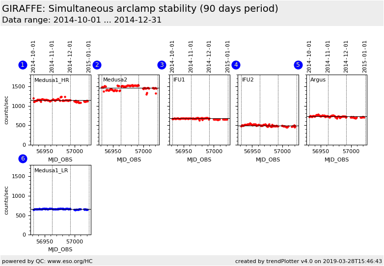 This is the trending plot monitoring the stability of the GIRAFFE SIMCAL arclamp and the 5 fibre systems.