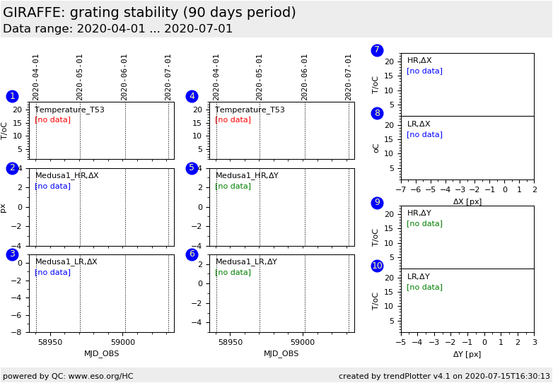 This is the trending plot monitoring the stability of the GIRAFFE high-resolution and low-resolution grating. It measures the thermal and non-thermal drifts of the gratings. These data are derived from the daily SIMLAMP,TAL health check measurements (HR grating: H525.8B setting; LR grating: L543.1).