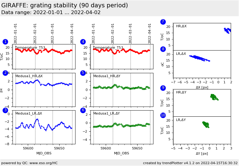 This is the trending plot monitoring the stability of the GIRAFFE high-resolution and low-resolution grating.