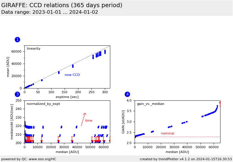 A sequence of image flats is exposed between 0.5 and 220 secs. Their average exposure level is plotted against the exposure time (box 1). The fitted function corresponds to mean = 245*exptime for the old CCD, and 195*exptime for the new CCD. In box 3, non-linear residuals are plotted vs. exposure time (new CCD only).