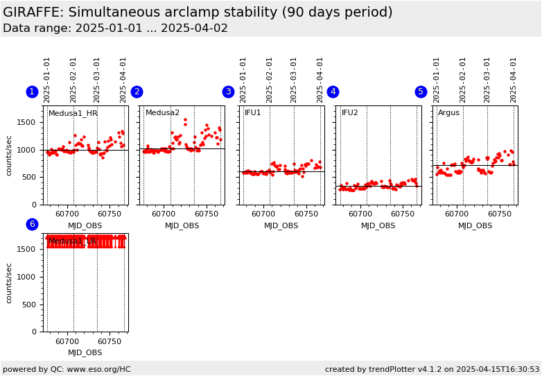 This is the trending plot monitoring the stability of the GIRAFFE SIMCAL arclamp and the 5 fibre systems.