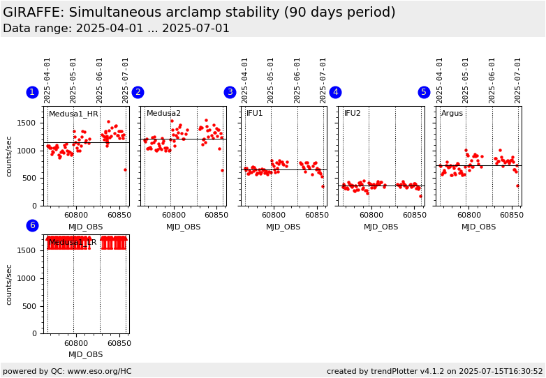 This is the trending plot monitoring the stability of the GIRAFFE SIMCAL arclamp and the 5 fibre systems.