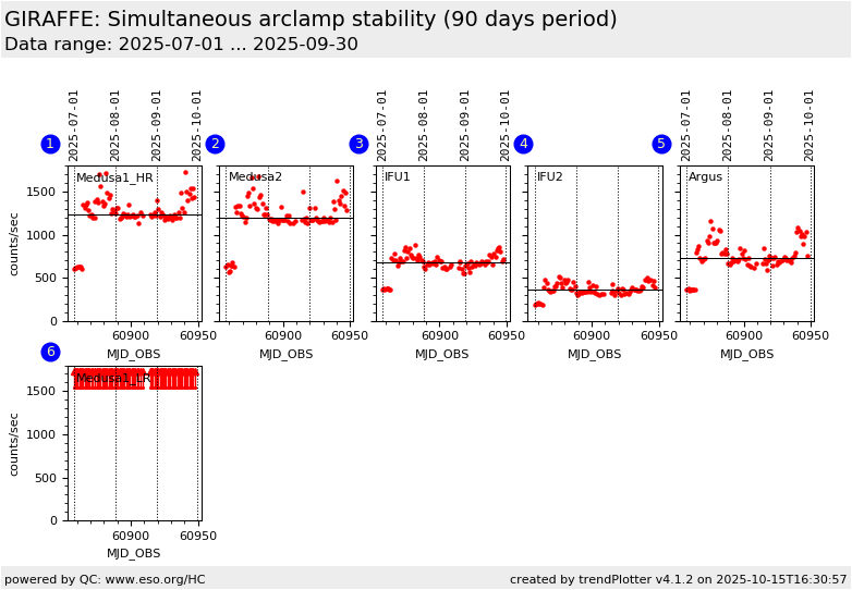 This is the trending plot monitoring the stability of the GIRAFFE SIMCAL arclamp and the 5 fibre systems.