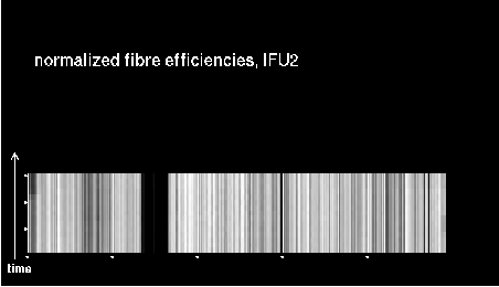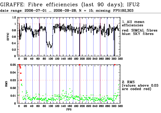 This is the trending plot for monitoring response and stability of the Giraffe fibres. Its purpose is to identify and monitor both fibre efficiency and stability. It helps identifying fibres with particularly low response, or unstable response. This may be useful e.g. for assigning sky fibres in the Medusa case. Input data are the Health Check fibre flats taken approximately every third day for the Medusa slits, and once a week for the IFu and Argus slits. The pipeline extracts the fibre signals and calculates relative efficiencies per fibre (normalized). These are averaged in chromatic (Y) direction and stored in a binary table, as a single transmission, or response, value per fibre. This table is appended as extension #1 to the product files with pro.catg=FF_EXTSPECTRA. Note that all of these files are robotic flats. Nasmyth flats are not included here because of their irregular acquisition, despite their better illumination pattern. The transmission numbers (columns FPS = fibre position index, and TRANSMISSION) are collected for all HC flats of a given 3 month period. Contrary to traditional QC parameters, they form a QC vector: one set of 135 (Medusa) or 317 (IFU, Argus) QC values per measurement. They are analyzed numerically to extract, per fibre, the following parameters: