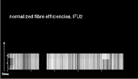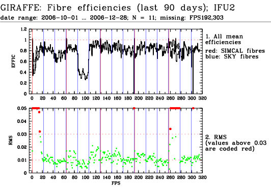 This is the trending plot for monitoring response and stability of the Giraffe fibres. Its purpose is to identify and monitor both fibre efficiency and stability. It helps identifying fibres with particularly low response, or unstable response. This may be useful e.g. for assigning sky fibres in the Medusa case. Input data are the Health Check fibre flats taken approximately every third day for the Medusa slits, and once a week for the IFu and Argus slits. The pipeline extracts the fibre signals and calculates relative efficiencies per fibre (normalized). These are averaged in chromatic (Y) direction and stored in a binary table, as a single transmission, or response, value per fibre. This table is appended as extension #1 to the product files with pro.catg=FF_EXTSPECTRA. Note that all of these files are robotic flats. Nasmyth flats are not included here because of their irregular acquisition, despite their better illumination pattern. The transmission numbers (columns FPS = fibre position index, and TRANSMISSION) are collected for all HC flats of a given 3 month period. Contrary to traditional QC parameters, they form a QC vector: one set of 135 (Medusa) or 317 (IFU, Argus) QC values per measurement. They are analyzed numerically to extract, per fibre, the following parameters: