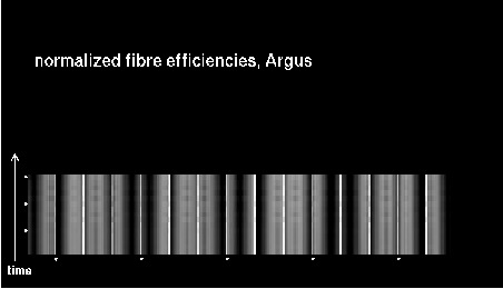 This is the trending plot for monitoring response and stability of the Giraffe fibres. Its purpose is to identify and monitor both fibre efficiency and stability. It helps identifying fibres with particularly low response, or unstable response. This may be useful e.g. for assigning sky fibres in the Medusa case. Input data are the Health Check fibre flats taken approximately every third day for the Medusa slits, and once a week for the IFu and Argus slits. The pipeline extracts the fibre signals and calculates relative efficiencies per fibre (normalized). These are averaged in chromatic (Y) direction and stored in a binary table, as a single transmission, or response, value per fibre. This table is appended as extension #1 to the product files with pro.catg=FF_EXTSPECTRA. Note that all of these files are robotic flats. Nasmyth flats are not included here because of their irregular acquisition, despite their better illumination pattern. The transmission numbers (columns FPS = fibre position index, and TRANSMISSION) are collected for all HC flats of a given 3 month period. Contrary to traditional QC parameters, they form a QC vector: one set of 135 (Medusa) or 317 (IFU, Argus) QC values per measurement. They are analyzed numerically to extract, per fibre, the following parameters: