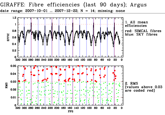 This is the trending plot for monitoring response and stability of the Giraffe fibres. Its purpose is to identify and monitor both fibre efficiency and stability. It helps identifying fibres with particularly low response, or unstable response. This may be useful e.g. for assigning sky fibres in the Medusa case. Input data are the Health Check fibre flats taken approximately every third day for the Medusa slits, and once a week for the IFu and Argus slits. The pipeline extracts the fibre signals and calculates relative efficiencies per fibre (normalized). These are averaged in chromatic (Y) direction and stored in a binary table, as a single transmission, or response, value per fibre. This table is appended as extension #1 to the product files with pro.catg=FF_EXTSPECTRA. Note that all of these files are robotic flats. Nasmyth flats are not included here because of their irregular acquisition, despite their better illumination pattern. The transmission numbers (columns FPS = fibre position index, and TRANSMISSION) are collected for all HC flats of a given 3 month period. Contrary to traditional QC parameters, they form a QC vector: one set of 135 (Medusa) or 317 (IFU, Argus) QC values per measurement. They are analyzed numerically to extract, per fibre, the following parameters: