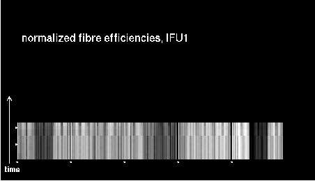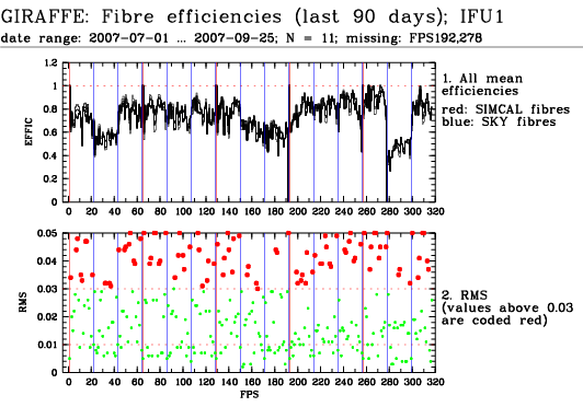 This is the trending plot for monitoring response and stability of the Giraffe fibres. Its purpose is to identify and monitor both fibre efficiency and stability. It helps identifying fibres with particularly low response, or unstable response. This may be useful e.g. for assigning sky fibres in the Medusa case. Input data are the Health Check fibre flats taken approximately every third day for the Medusa slits, and once a week for the IFu and Argus slits. The pipeline extracts the fibre signals and calculates relative efficiencies per fibre (normalized). These are averaged in chromatic (Y) direction and stored in a binary table, as a single transmission, or response, value per fibre. This table is appended as extension #1 to the product files with pro.catg=FF_EXTSPECTRA. Note that all of these files are robotic flats. Nasmyth flats are not included here because of their irregular acquisition, despite their better illumination pattern. The transmission numbers (columns FPS = fibre position index, and TRANSMISSION) are collected for all HC flats of a given 3 month period. Contrary to traditional QC parameters, they form a QC vector: one set of 135 (Medusa) or 317 (IFU, Argus) QC values per measurement. They are analyzed numerically to extract, per fibre, the following parameters: