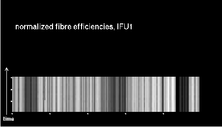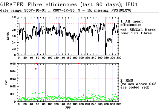 This is the trending plot for monitoring response and stability of the Giraffe fibres. Its purpose is to identify and monitor both fibre efficiency and stability. It helps identifying fibres with particularly low response, or unstable response. This may be useful e.g. for assigning sky fibres in the Medusa case. Input data are the Health Check fibre flats taken approximately every third day for the Medusa slits, and once a week for the IFu and Argus slits. The pipeline extracts the fibre signals and calculates relative efficiencies per fibre (normalized). These are averaged in chromatic (Y) direction and stored in a binary table, as a single transmission, or response, value per fibre. This table is appended as extension #1 to the product files with pro.catg=FF_EXTSPECTRA. Note that all of these files are robotic flats. Nasmyth flats are not included here because of their irregular acquisition, despite their better illumination pattern. The transmission numbers (columns FPS = fibre position index, and TRANSMISSION) are collected for all HC flats of a given 3 month period. Contrary to traditional QC parameters, they form a QC vector: one set of 135 (Medusa) or 317 (IFU, Argus) QC values per measurement. They are analyzed numerically to extract, per fibre, the following parameters: