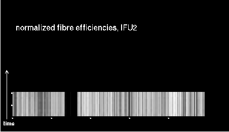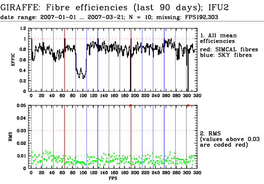 This is the trending plot for monitoring response and stability of the Giraffe fibres. Its purpose is to identify and monitor both fibre efficiency and stability. It helps identifying fibres with particularly low response, or unstable response. This may be useful e.g. for assigning sky fibres in the Medusa case. Input data are the Health Check fibre flats taken approximately every third day for the Medusa slits, and once a week for the IFu and Argus slits. The pipeline extracts the fibre signals and calculates relative efficiencies per fibre (normalized). These are averaged in chromatic (Y) direction and stored in a binary table, as a single transmission, or response, value per fibre. This table is appended as extension #1 to the product files with pro.catg=FF_EXTSPECTRA. Note that all of these files are robotic flats. Nasmyth flats are not included here because of their irregular acquisition, despite their better illumination pattern. The transmission numbers (columns FPS = fibre position index, and TRANSMISSION) are collected for all HC flats of a given 3 month period. Contrary to traditional QC parameters, they form a QC vector: one set of 135 (Medusa) or 317 (IFU, Argus) QC values per measurement. They are analyzed numerically to extract, per fibre, the following parameters: