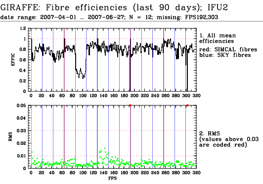 This is the trending plot for monitoring response and stability of the Giraffe fibres. Its purpose is to identify and monitor both fibre efficiency and stability. It helps identifying fibres with particularly low response, or unstable response. This may be useful e.g. for assigning sky fibres in the Medusa case. Input data are the Health Check fibre flats taken approximately every third day for the Medusa slits, and once a week for the IFu and Argus slits. The pipeline extracts the fibre signals and calculates relative efficiencies per fibre (normalized). These are averaged in chromatic (Y) direction and stored in a binary table, as a single transmission, or response, value per fibre. This table is appended as extension #1 to the product files with pro.catg=FF_EXTSPECTRA. Note that all of these files are robotic flats. Nasmyth flats are not included here because of their irregular acquisition, despite their better illumination pattern. The transmission numbers (columns FPS = fibre position index, and TRANSMISSION) are collected for all HC flats of a given 3 month period. Contrary to traditional QC parameters, they form a QC vector: one set of 135 (Medusa) or 317 (IFU, Argus) QC values per measurement. They are analyzed numerically to extract, per fibre, the following parameters: