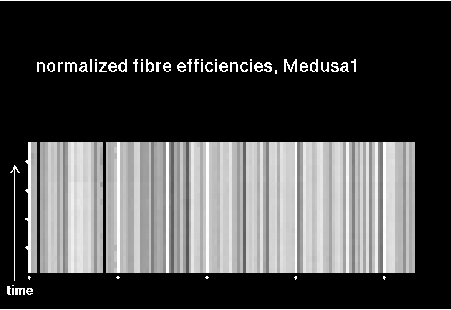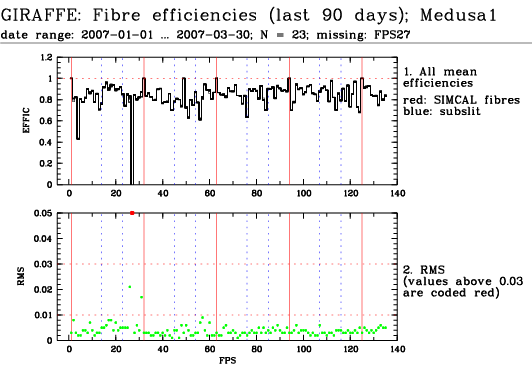 This is the trending plot for monitoring response and stability of the Giraffe fibres. Its purpose is to identify and monitor both fibre efficiency and stability. It helps identifying fibres with particularly low response, or unstable response. This may be useful e.g. for assigning sky fibres in the Medusa case. Input data are the Health Check fibre flats taken approximately every third day for the Medusa slits, and once a week for the IFu and Argus slits. The pipeline extracts the fibre signals and calculates relative efficiencies per fibre (normalized). These are averaged in chromatic (Y) direction and stored in a binary table, as a single transmission, or response, value per fibre. This table is appended as extension #1 to the product files with pro.catg=FF_EXTSPECTRA. Note that all of these files are robotic flats. Nasmyth flats are not included here because of their irregular acquisition, despite their better illumination pattern. The transmission numbers (columns FPS = fibre position index, and TRANSMISSION) are collected for all HC flats of a given 3 month period. Contrary to traditional QC parameters, they form a QC vector: one set of 135 (Medusa) or 317 (IFU, Argus) QC values per measurement. They are analyzed numerically to extract, per fibre, the following parameters: