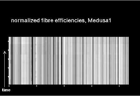 Each transmission vector is normalized to give the same average transmission (excluding broken fibres), so that subtle normalization differences hopefully cancel out and the rms values indeed reflect fibre instabilities only. The two plots on top display the following: