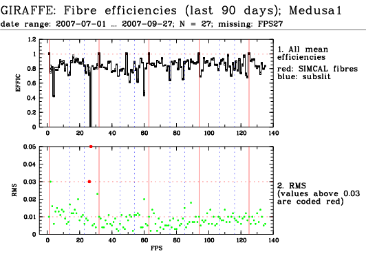 This is the trending plot for monitoring response and stability of the Giraffe fibres. Its purpose is to identify and monitor both fibre efficiency and stability. It helps identifying fibres with particularly low response, or unstable response. This may be useful e.g. for assigning sky fibres in the Medusa case. Input data are the Health Check fibre flats taken approximately every third day for the Medusa slits, and once a week for the IFu and Argus slits. The pipeline extracts the fibre signals and calculates relative efficiencies per fibre (normalized). These are averaged in chromatic (Y) direction and stored in a binary table, as a single transmission, or response, value per fibre. This table is appended as extension #1 to the product files with pro.catg=FF_EXTSPECTRA. Note that all of these files are robotic flats. Nasmyth flats are not included here because of their irregular acquisition, despite their better illumination pattern. The transmission numbers (columns FPS = fibre position index, and TRANSMISSION) are collected for all HC flats of a given 3 month period. Contrary to traditional QC parameters, they form a QC vector: one set of 135 (Medusa) or 317 (IFU, Argus) QC values per measurement. They are analyzed numerically to extract, per fibre, the following parameters: