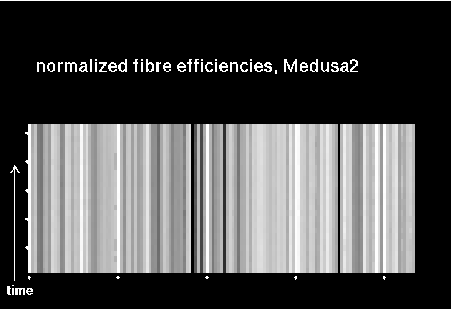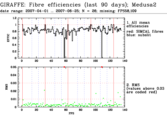 This is the trending plot for monitoring response and stability of the Giraffe fibres. Its purpose is to identify and monitor both fibre efficiency and stability. It helps identifying fibres with particularly low response, or unstable response. This may be useful e.g. for assigning sky fibres in the Medusa case. Input data are the Health Check fibre flats taken approximately every third day for the Medusa slits, and once a week for the IFu and Argus slits. The pipeline extracts the fibre signals and calculates relative efficiencies per fibre (normalized). These are averaged in chromatic (Y) direction and stored in a binary table, as a single transmission, or response, value per fibre. This table is appended as extension #1 to the product files with pro.catg=FF_EXTSPECTRA. Note that all of these files are robotic flats. Nasmyth flats are not included here because of their irregular acquisition, despite their better illumination pattern. The transmission numbers (columns FPS = fibre position index, and TRANSMISSION) are collected for all HC flats of a given 3 month period. Contrary to traditional QC parameters, they form a QC vector: one set of 135 (Medusa) or 317 (IFU, Argus) QC values per measurement. They are analyzed numerically to extract, per fibre, the following parameters: