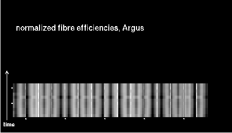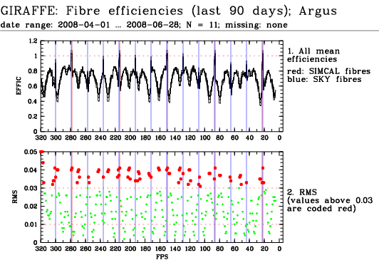 This is the trending plot for monitoring response and stability of the Giraffe fibres. Its purpose is to identify and monitor both fibre efficiency and stability. It helps identifying fibres with particularly low response, or unstable response. This may be useful e.g. for assigning sky fibres in the Medusa case. Input data are the Health Check fibre flats taken approximately every third day for the Medusa slits, and once a week for the IFu and Argus slits. The pipeline extracts the fibre signals and calculates relative efficiencies per fibre (normalized). These are averaged in chromatic (Y) direction and stored in a binary table, as a single transmission, or response, value per fibre. This table is appended as extension #1 to the product files with pro.catg=FF_EXTSPECTRA. Note that all of these files are robotic flats. Nasmyth flats are not included here because of their irregular acquisition, despite their better illumination pattern. The transmission numbers (columns FPS = fibre position index, and TRANSMISSION) are collected for all HC flats of a given 3 month period. Contrary to traditional QC parameters, they form a QC vector: one set of 135 (Medusa) or 317 (IFU, Argus) QC values per measurement. They are analyzed numerically to extract, per fibre, the following parameters: