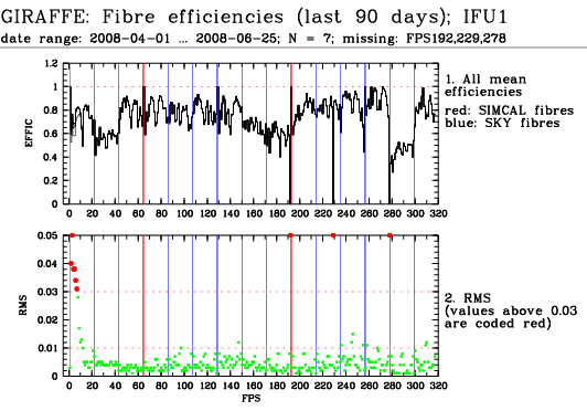 This is the trending plot for monitoring response and stability of the Giraffe fibres. Its purpose is to identify and monitor both fibre efficiency and stability. It helps identifying fibres with particularly low response, or unstable response. This may be useful e.g. for assigning sky fibres in the Medusa case. Input data are the Health Check fibre flats taken approximately every third day for the Medusa slits, and once a week for the IFu and Argus slits. The pipeline extracts the fibre signals and calculates relative efficiencies per fibre (normalized). These are averaged in chromatic (Y) direction and stored in a binary table, as a single transmission, or response, value per fibre. This table is appended as extension #1 to the product files with pro.catg=FF_EXTSPECTRA. Note that all of these files are robotic flats. Nasmyth flats are not included here because of their irregular acquisition, despite their better illumination pattern. The transmission numbers (columns FPS = fibre position index, and TRANSMISSION) are collected for all HC flats of a given 3 month period. Contrary to traditional QC parameters, they form a QC vector: one set of 135 (Medusa) or 317 (IFU, Argus) QC values per measurement. They are analyzed numerically to extract, per fibre, the following parameters: