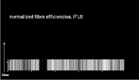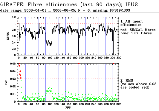 This is the trending plot for monitoring response and stability of the Giraffe fibres. Its purpose is to identify and monitor both fibre efficiency and stability. It helps identifying fibres with particularly low response, or unstable response. This may be useful e.g. for assigning sky fibres in the Medusa case. Input data are the Health Check fibre flats taken approximately every third day for the Medusa slits, and once a week for the IFu and Argus slits. The pipeline extracts the fibre signals and calculates relative efficiencies per fibre (normalized). These are averaged in chromatic (Y) direction and stored in a binary table, as a single transmission, or response, value per fibre. This table is appended as extension #1 to the product files with pro.catg=FF_EXTSPECTRA. Note that all of these files are robotic flats. Nasmyth flats are not included here because of their irregular acquisition, despite their better illumination pattern. The transmission numbers (columns FPS = fibre position index, and TRANSMISSION) are collected for all HC flats of a given 3 month period. Contrary to traditional QC parameters, they form a QC vector: one set of 135 (Medusa) or 317 (IFU, Argus) QC values per measurement. They are analyzed numerically to extract, per fibre, the following parameters: