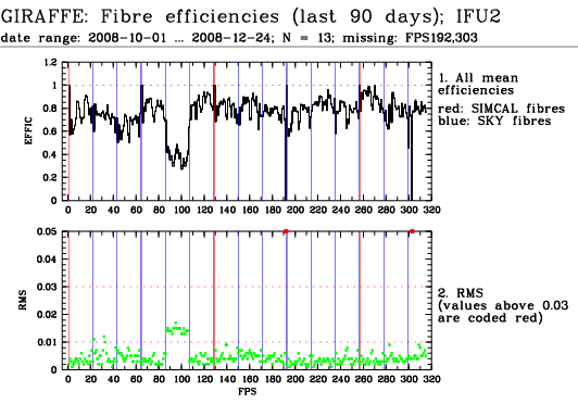 This is the trending plot for monitoring response and stability of the Giraffe fibres. Its purpose is to identify and monitor both fibre efficiency and stability. It helps identifying fibres with particularly low response, or unstable response. This may be useful e.g. for assigning sky fibres in the Medusa case. Input data are the Health Check fibre flats taken approximately every third day for the Medusa slits, and once a week for the IFu and Argus slits. The pipeline extracts the fibre signals and calculates relative efficiencies per fibre (normalized). These are averaged in chromatic (Y) direction and stored in a binary table, as a single transmission, or response, value per fibre. This table is appended as extension #1 to the product files with pro.catg=FF_EXTSPECTRA. Note that all of these files are robotic flats. Nasmyth flats are not included here because of their irregular acquisition, despite their better illumination pattern. The transmission numbers (columns FPS = fibre position index, and TRANSMISSION) are collected for all HC flats of a given 3 month period. Contrary to traditional QC parameters, they form a QC vector: one set of 135 (Medusa) or 317 (IFU, Argus) QC values per measurement. They are analyzed numerically to extract, per fibre, the following parameters: