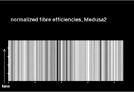 Each transmission vector is normalized to give the same average transmission (excluding broken fibres), so that subtle normalization differences hopefully cancel out and the rms values indeed reflect fibre instabilities only. The two plots on top display the following: