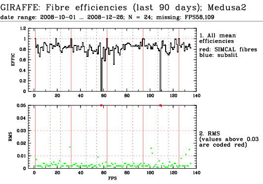 This is the trending plot for monitoring response and stability of the Giraffe fibres. Its purpose is to identify and monitor both fibre efficiency and stability. It helps identifying fibres with particularly low response, or unstable response. This may be useful e.g. for assigning sky fibres in the Medusa case. Input data are the Health Check fibre flats taken approximately every third day for the Medusa slits, and once a week for the IFu and Argus slits. The pipeline extracts the fibre signals and calculates relative efficiencies per fibre (normalized). These are averaged in chromatic (Y) direction and stored in a binary table, as a single transmission, or response, value per fibre. This table is appended as extension #1 to the product files with pro.catg=FF_EXTSPECTRA. Note that all of these files are robotic flats. Nasmyth flats are not included here because of their irregular acquisition, despite their better illumination pattern. The transmission numbers (columns FPS = fibre position index, and TRANSMISSION) are collected for all HC flats of a given 3 month period. Contrary to traditional QC parameters, they form a QC vector: one set of 135 (Medusa) or 317 (IFU, Argus) QC values per measurement. They are analyzed numerically to extract, per fibre, the following parameters: