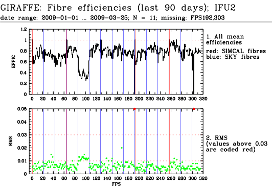 This is the trending plot for monitoring response and stability of the Giraffe fibres. Its purpose is to identify and monitor both fibre efficiency and stability. It helps identifying fibres with particularly low response, or unstable response. This may be useful e.g. for assigning sky fibres in the Medusa case. Input data are the Health Check fibre flats taken approximately every third day for the Medusa slits, and once a week for the IFu and Argus slits. The pipeline extracts the fibre signals and calculates relative efficiencies per fibre (normalized). These are averaged in chromatic (Y) direction and stored in a binary table, as a single transmission, or response, value per fibre. This table is appended as extension #1 to the product files with pro.catg=FF_EXTSPECTRA. Note that all of these files are robotic flats. Nasmyth flats are not included here because of their irregular acquisition, despite their better illumination pattern. The transmission numbers (columns FPS = fibre position index, and TRANSMISSION) are collected for all HC flats of a given 3 month period. Contrary to traditional QC parameters, they form a QC vector: one set of 135 (Medusa) or 317 (IFU, Argus) QC values per measurement. They are analyzed numerically to extract, per fibre, the following parameters: