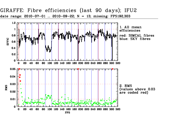 This is the trending plot for monitoring response and stability of the Giraffe fibres. Its purpose is to identify and monitor both fibre efficiency and stability. It helps identifying fibres with particularly low response, or unstable response. This may be useful e.g. for assigning sky fibres in the Medusa case. Input data are the Health Check fibre flats taken approximately every third day for the Medusa slits, and once a week for the IFu and Argus slits. The pipeline extracts the fibre signals and calculates relative efficiencies per fibre (normalized). These are averaged in chromatic (Y) direction and stored in a binary table, as a single transmission, or response, value per fibre. This table is appended as extension #1 to the product files with pro.catg=FF_EXTSPECTRA. Note that all of these files are robotic flats. Nasmyth flats are not included here because of their irregular acquisition, despite their better illumination pattern. The transmission numbers (columns FPS = fibre position index, and TRANSMISSION) are collected for all HC flats of a given 3 month period. Contrary to traditional QC parameters, they form a QC vector: one set of 135 (Medusa) or 317 (IFU, Argus) QC values per measurement. They are analyzed numerically to extract, per fibre, the following parameters: