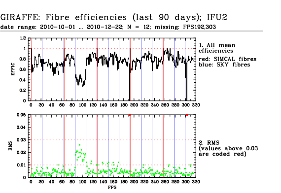 This is the trending plot for monitoring response and stability of the Giraffe fibres. Its purpose is to identify and monitor both fibre efficiency and stability. It helps identifying fibres with particularly low response, or unstable response. This may be useful e.g. for assigning sky fibres in the Medusa case. Input data are the Health Check fibre flats taken approximately every third day for the Medusa slits, and once a week for the IFu and Argus slits. The pipeline extracts the fibre signals and calculates relative efficiencies per fibre (normalized). These are averaged in chromatic (Y) direction and stored in a binary table, as a single transmission, or response, value per fibre. This table is appended as extension #1 to the product files with pro.catg=FF_EXTSPECTRA. Note that all of these files are robotic flats. Nasmyth flats are not included here because of their irregular acquisition, despite their better illumination pattern. The transmission numbers (columns FPS = fibre position index, and TRANSMISSION) are collected for all HC flats of a given 3 month period. Contrary to traditional QC parameters, they form a QC vector: one set of 135 (Medusa) or 317 (IFU, Argus) QC values per measurement. They are analyzed numerically to extract, per fibre, the following parameters: