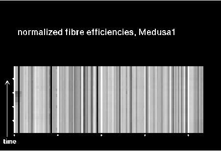 Each transmission vector is normalized to give the same average transmission (excluding broken fibres), so that subtle normalization differences hopefully cancel out and the rms values indeed reflect fibre instabilities only. The two plots on top display the following:
