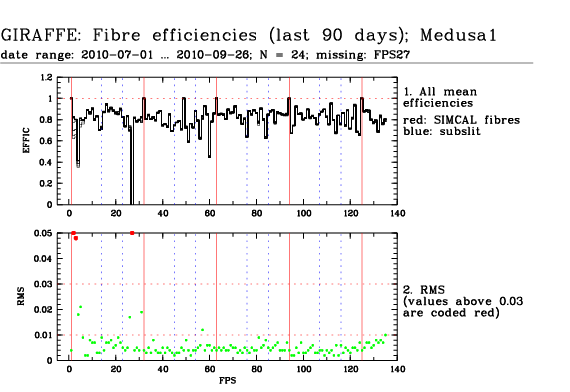 This is the trending plot for monitoring response and stability of the Giraffe fibres. Its purpose is to identify and monitor both fibre efficiency and stability. It helps identifying fibres with particularly low response, or unstable response. This may be useful e.g. for assigning sky fibres in the Medusa case. Input data are the Health Check fibre flats taken approximately every third day for the Medusa slits, and once a week for the IFu and Argus slits. The pipeline extracts the fibre signals and calculates relative efficiencies per fibre (normalized). These are averaged in chromatic (Y) direction and stored in a binary table, as a single transmission, or response, value per fibre. This table is appended as extension #1 to the product files with pro.catg=FF_EXTSPECTRA. Note that all of these files are robotic flats. Nasmyth flats are not included here because of their irregular acquisition, despite their better illumination pattern. The transmission numbers (columns FPS = fibre position index, and TRANSMISSION) are collected for all HC flats of a given 3 month period. Contrary to traditional QC parameters, they form a QC vector: one set of 135 (Medusa) or 317 (IFU, Argus) QC values per measurement. They are analyzed numerically to extract, per fibre, the following parameters: