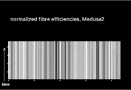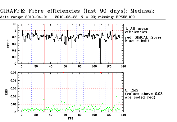 This is the trending plot for monitoring response and stability of the Giraffe fibres. Its purpose is to identify and monitor both fibre efficiency and stability. It helps identifying fibres with particularly low response, or unstable response. This may be useful e.g. for assigning sky fibres in the Medusa case. Input data are the Health Check fibre flats taken approximately every third day for the Medusa slits, and once a week for the IFu and Argus slits. The pipeline extracts the fibre signals and calculates relative efficiencies per fibre (normalized). These are averaged in chromatic (Y) direction and stored in a binary table, as a single transmission, or response, value per fibre. This table is appended as extension #1 to the product files with pro.catg=FF_EXTSPECTRA. Note that all of these files are robotic flats. Nasmyth flats are not included here because of their irregular acquisition, despite their better illumination pattern. The transmission numbers (columns FPS = fibre position index, and TRANSMISSION) are collected for all HC flats of a given 3 month period. Contrary to traditional QC parameters, they form a QC vector: one set of 135 (Medusa) or 317 (IFU, Argus) QC values per measurement. They are analyzed numerically to extract, per fibre, the following parameters: