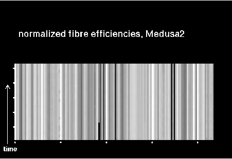 Each transmission vector is normalized to give the same average transmission (excluding broken fibres), so that subtle normalization differences hopefully cancel out and the rms values indeed reflect fibre instabilities only. The two plots on top display the following: