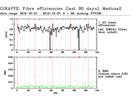 This is the trending plot for monitoring response and stability of the Giraffe fibres. Its purpose is to identify and monitor both fibre efficiency and stability. It helps identifying fibres with particularly low response, or unstable response. This may be useful e.g. for assigning sky fibres in the Medusa case. Input data are the Health Check fibre flats taken approximately every third day for the Medusa slits, and once a week for the IFu and Argus slits. The pipeline extracts the fibre signals and calculates relative efficiencies per fibre (normalized). These are averaged in chromatic (Y) direction and stored in a binary table, as a single transmission, or response, value per fibre. This table is appended as extension #1 to the product files with pro.catg=FF_EXTSPECTRA. Note that all of these files are robotic flats. Nasmyth flats are not included here because of their irregular acquisition, despite their better illumination pattern. The transmission numbers (columns FPS = fibre position index, and TRANSMISSION) are collected for all HC flats of a given 3 month period. Contrary to traditional QC parameters, they form a QC vector: one set of 135 (Medusa) or 317 (IFU, Argus) QC values per measurement. They are analyzed numerically to extract, per fibre, the following parameters: