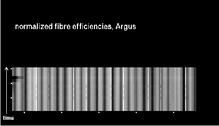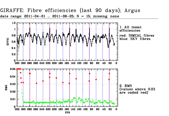 This is the trending plot for monitoring response and stability of the Giraffe fibres. Its purpose is to identify and monitor both fibre efficiency and stability. It helps identifying fibres with particularly low response, or unstable response. This may be useful e.g. for assigning sky fibres in the Medusa case. Input data are the Health Check fibre flats taken approximately every third day for the Medusa slits, and once a week for the IFu and Argus slits. The pipeline extracts the fibre signals and calculates relative efficiencies per fibre (normalized). These are averaged in chromatic (Y) direction and stored in a binary table, as a single transmission, or response, value per fibre. This table is appended as extension #1 to the product files with pro.catg=FF_EXTSPECTRA. Note that all of these files are robotic flats. Nasmyth flats are not included here because of their irregular acquisition, despite their better illumination pattern. The transmission numbers (columns FPS = fibre position index, and TRANSMISSION) are collected for all HC flats of a given 3 month period. Contrary to traditional QC parameters, they form a QC vector: one set of 135 (Medusa) or 317 (IFU, Argus) QC values per measurement. They are analyzed numerically to extract, per fibre, the following parameters: