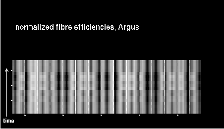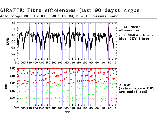This is the trending plot for monitoring response and stability of the Giraffe fibres. Its purpose is to identify and monitor both fibre efficiency and stability. It helps identifying fibres with particularly low response, or unstable response. This may be useful e.g. for assigning sky fibres in the Medusa case. Input data are the Health Check fibre flats taken approximately every third day for the Medusa slits, and once a week for the IFu and Argus slits. The pipeline extracts the fibre signals and calculates relative efficiencies per fibre (normalized). These are averaged in chromatic (Y) direction and stored in a binary table, as a single transmission, or response, value per fibre. This table is appended as extension #1 to the product files with pro.catg=FF_EXTSPECTRA. Note that all of these files are robotic flats. Nasmyth flats are not included here because of their irregular acquisition, despite their better illumination pattern. The transmission numbers (columns FPS = fibre position index, and TRANSMISSION) are collected for all HC flats of a given 3 month period. Contrary to traditional QC parameters, they form a QC vector: one set of 135 (Medusa) or 317 (IFU, Argus) QC values per measurement. They are analyzed numerically to extract, per fibre, the following parameters:
