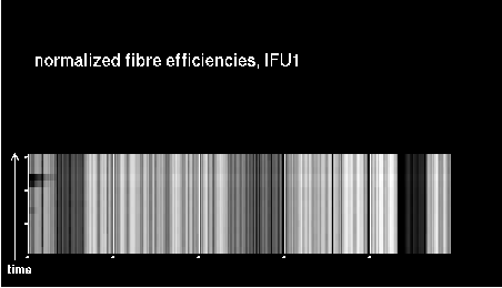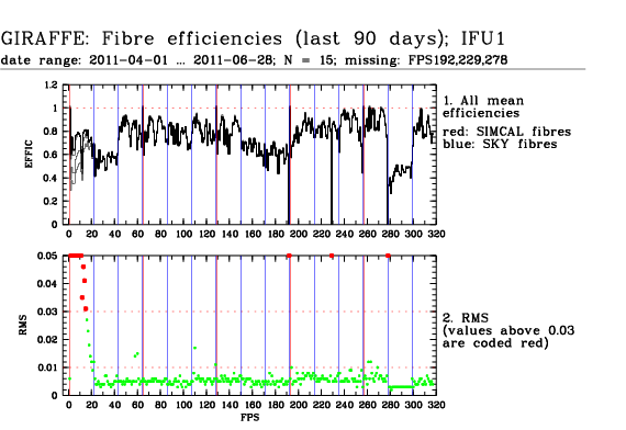 This is the trending plot for monitoring response and stability of the Giraffe fibres. Its purpose is to identify and monitor both fibre efficiency and stability. It helps identifying fibres with particularly low response, or unstable response. This may be useful e.g. for assigning sky fibres in the Medusa case. Input data are the Health Check fibre flats taken approximately every third day for the Medusa slits, and once a week for the IFu and Argus slits. The pipeline extracts the fibre signals and calculates relative efficiencies per fibre (normalized). These are averaged in chromatic (Y) direction and stored in a binary table, as a single transmission, or response, value per fibre. This table is appended as extension #1 to the product files with pro.catg=FF_EXTSPECTRA. Note that all of these files are robotic flats. Nasmyth flats are not included here because of their irregular acquisition, despite their better illumination pattern. The transmission numbers (columns FPS = fibre position index, and TRANSMISSION) are collected for all HC flats of a given 3 month period. Contrary to traditional QC parameters, they form a QC vector: one set of 135 (Medusa) or 317 (IFU, Argus) QC values per measurement. They are analyzed numerically to extract, per fibre, the following parameters: