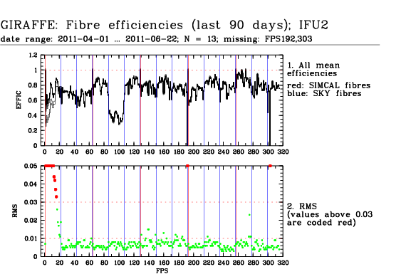 This is the trending plot for monitoring response and stability of the Giraffe fibres. Its purpose is to identify and monitor both fibre efficiency and stability. It helps identifying fibres with particularly low response, or unstable response. This may be useful e.g. for assigning sky fibres in the Medusa case. Input data are the Health Check fibre flats taken approximately every third day for the Medusa slits, and once a week for the IFu and Argus slits. The pipeline extracts the fibre signals and calculates relative efficiencies per fibre (normalized). These are averaged in chromatic (Y) direction and stored in a binary table, as a single transmission, or response, value per fibre. This table is appended as extension #1 to the product files with pro.catg=FF_EXTSPECTRA. Note that all of these files are robotic flats. Nasmyth flats are not included here because of their irregular acquisition, despite their better illumination pattern. The transmission numbers (columns FPS = fibre position index, and TRANSMISSION) are collected for all HC flats of a given 3 month period. Contrary to traditional QC parameters, they form a QC vector: one set of 135 (Medusa) or 317 (IFU, Argus) QC values per measurement. They are analyzed numerically to extract, per fibre, the following parameters: