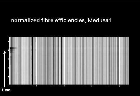 Each transmission vector is normalized to give the same average transmission (excluding broken fibres), so that subtle normalization differences hopefully cancel out and the rms values indeed reflect fibre instabilities only. The two plots on top display the following: