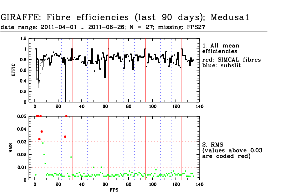 This is the trending plot for monitoring response and stability of the Giraffe fibres. Its purpose is to identify and monitor both fibre efficiency and stability. It helps identifying fibres with particularly low response, or unstable response. This may be useful e.g. for assigning sky fibres in the Medusa case. Input data are the Health Check fibre flats taken approximately every third day for the Medusa slits, and once a week for the IFu and Argus slits. The pipeline extracts the fibre signals and calculates relative efficiencies per fibre (normalized). These are averaged in chromatic (Y) direction and stored in a binary table, as a single transmission, or response, value per fibre. This table is appended as extension #1 to the product files with pro.catg=FF_EXTSPECTRA. Note that all of these files are robotic flats. Nasmyth flats are not included here because of their irregular acquisition, despite their better illumination pattern. The transmission numbers (columns FPS = fibre position index, and TRANSMISSION) are collected for all HC flats of a given 3 month period. Contrary to traditional QC parameters, they form a QC vector: one set of 135 (Medusa) or 317 (IFU, Argus) QC values per measurement. They are analyzed numerically to extract, per fibre, the following parameters: